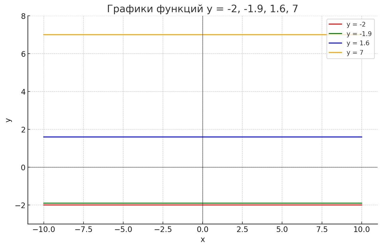 Чтобы построить графики функций \( y = -2 \), \( y = -1.9 \), \( y = 1.6 \), \( y = 7 \), нужно понимать, что каждая из этих функций представляет собой линейную функцию, где значение \( y \) остается постоянным для любого значения \( x \). Это означает, что графиком каждой функции будет прямая линия, параллельная оси \( x \).