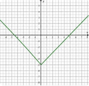 Функция принимает вид кусочной функции: \( y = \begin{cases} x — 5, \text{ если } x \geq 0 \\ -x — 5, \text{ если } x < 0 \end{cases} \). График функции состоит из двух линейных частей, которые соединяются в точке \( x = 0 \), где функция непрерывна.